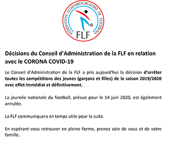 Vu les récentes évolutions, le Conseil d’Administration de la FLF a pris la décision d’annuler tous les matches de football et de futsal au Luxembourg, ceci à partir d’aujourd’hui et jusqu’à nouvel ordre.